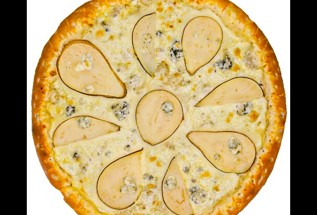 Фирменный соус + сливки, сыр моцарелла, груша конференция, сыр дор блю, пармезан.