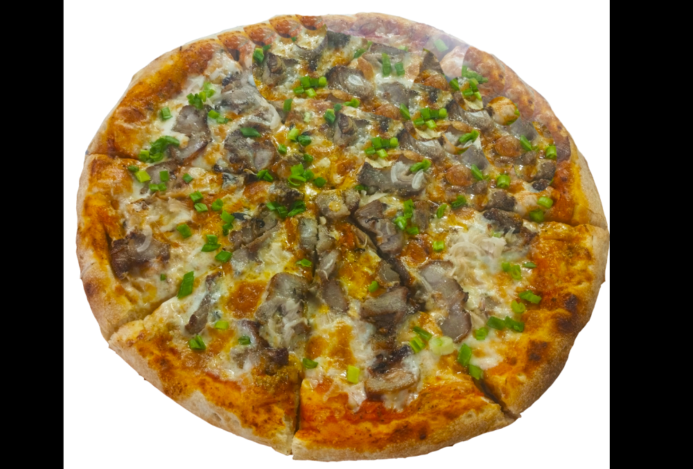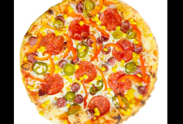 острый микс с кисло-сладким и томатным соусом, сыром моцарелла, пикантным пепперони, ароматной охотничьей колбаской, сочным болгарским перцем, острым перцем халапеньо и сладкой кукурузой.