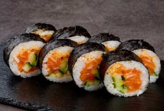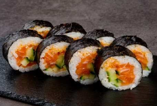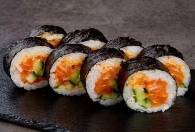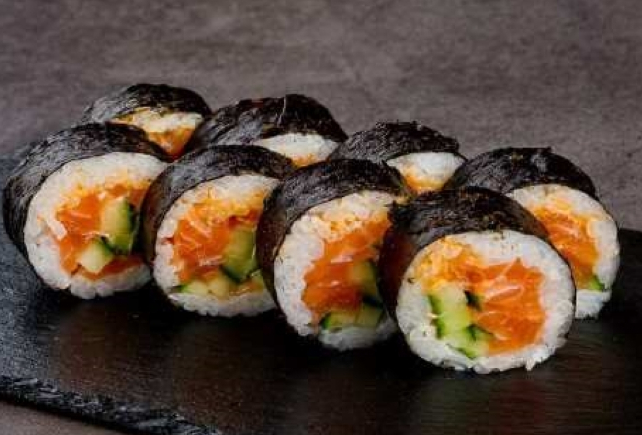 Рис,нори,Копчёная куриная грудка,спайси сойс,огурец свежий, сыр креметте.
